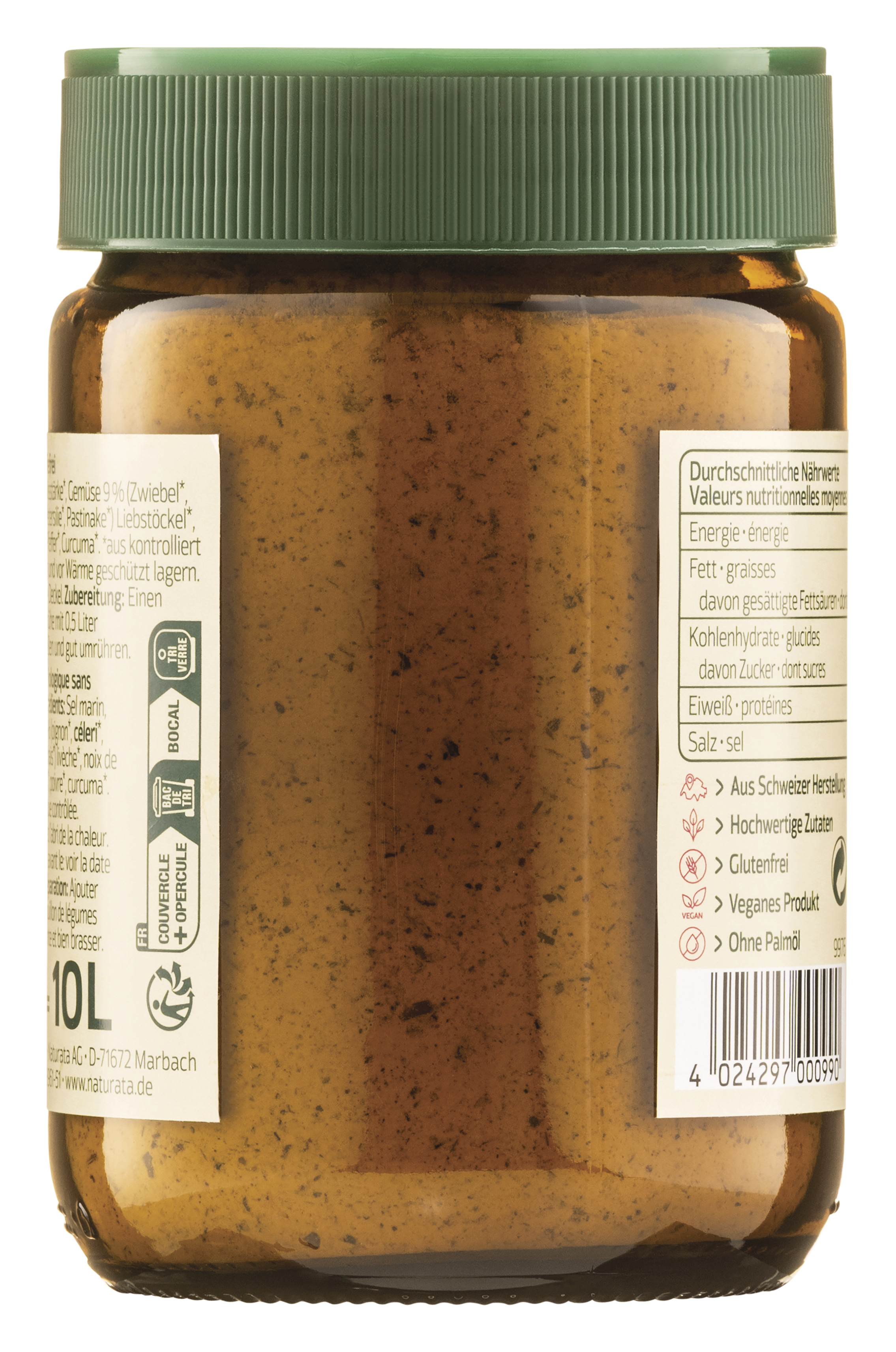 | Zutaten: | Meersalz, Maisstärke*, Gemüse 9 % (Zwiebel*, SELLERIE*, Lauch*, Karotte*, Petersilie*, Pastinake*) Liebstöckel*, Muskat*, Sonnenblumenöl*, Pfeffer*, Curcuma* *kontrolliert biologischer Anbau | ||||||||||||